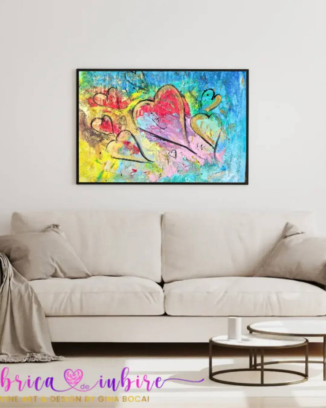 O explozie de inimi care plutesc într-un spațiu viu, colorat, ca o hartă a emoțiilor trăite și împărtășite. Fiecare inimă poartă o vibrație diferită – bucurie, fragilitate, curaj, deschidere – dar toate coexistă în același câmp al iubirii, fără separare.