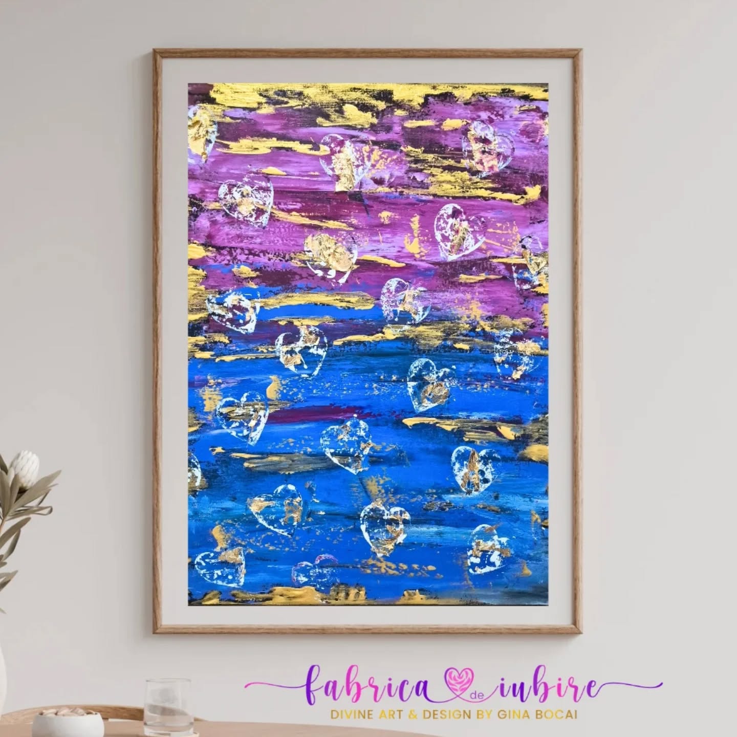 Un spațiu dintre cer și pamânt, dintre vis și realitate, pictat în albastru profund și roz blând, străbătut de dâre aurii ca niște binecuvântări.